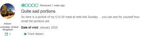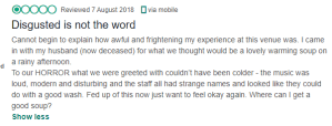 There are two options here, her husband died not long after the soup fiasco and it’s the cold soup that’s hit her the hardest OR quite a lot of time has gone by, her husband has long passed away and she’s seen something that sets her off, suddenly she focuses all of her anger on bringing down this soup establishment with the funny named staff. They must pay for what they have done and she will stop at nothing to honour her husband’s memory and destroy the soup elite. Watch out, Manchester, for the soup widow will bring you down and will expose you for your shoddy soup. Yes, we have ignored the “just want to feel okay again” because it’s haunting and she immediately asks for her next victim. *There are feelings that this is not a real review, but the internet doesn’t care about that does it?!*