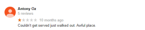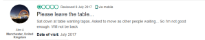 “Customer sits at a table without a booking. Asked to move as other people were waiting for the table. Gets angry and refuses to come back. Business cries.”