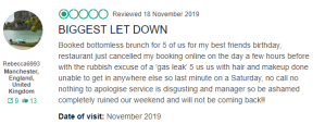 The manager’s response? “We had a gas leak”. Do customers think that everyone just gathers round at the start of the day and chooses one booking at random to cancel? “LADS, what about this one. Let’s tell her there’s a gas leak and hope she doesn’t happen to come by and check. Hopefully she’ll get her hair and makeup done to justify this random culling of profit”. Imagine the papers the next day: “Bar explodes killing 50 people. Rebecca6993 was amongst the victims, police say she is badly burnt and was almost unrecognisable if it were not for the fact she’d had her hair and makeup done. We spoke to those that knew her: “She would have wanted to go out this way, it was either this or be all done-up for nothing, it was last minute on a Saturday after all.”