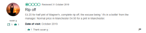 You get lured in by Susan’s initial comment (she HAD to be called Susan). £4.25 for half a pint of Magners IS expensive, you have been ripped o… oh, it was a bottle. You paid the price of a bottle and complained because pints in Manchester are cheaper in Manchester. Susan, you’ve brought shame on this respected name.
