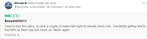 “Lads, shall we go to this bar that I love so much. Oh, they’ve got live music on, which is acoustic, but let’s not tell anyone that as it might invalidate any reviews I might wish to write in the future. We can just talk louder. Sorted. Leave it to your old friend Michael B to find the solution to the problem. They’re telling us to be quiet? Well I never! Come, let’s all leave and never come back. I’ve never met ruder people in my life.”
